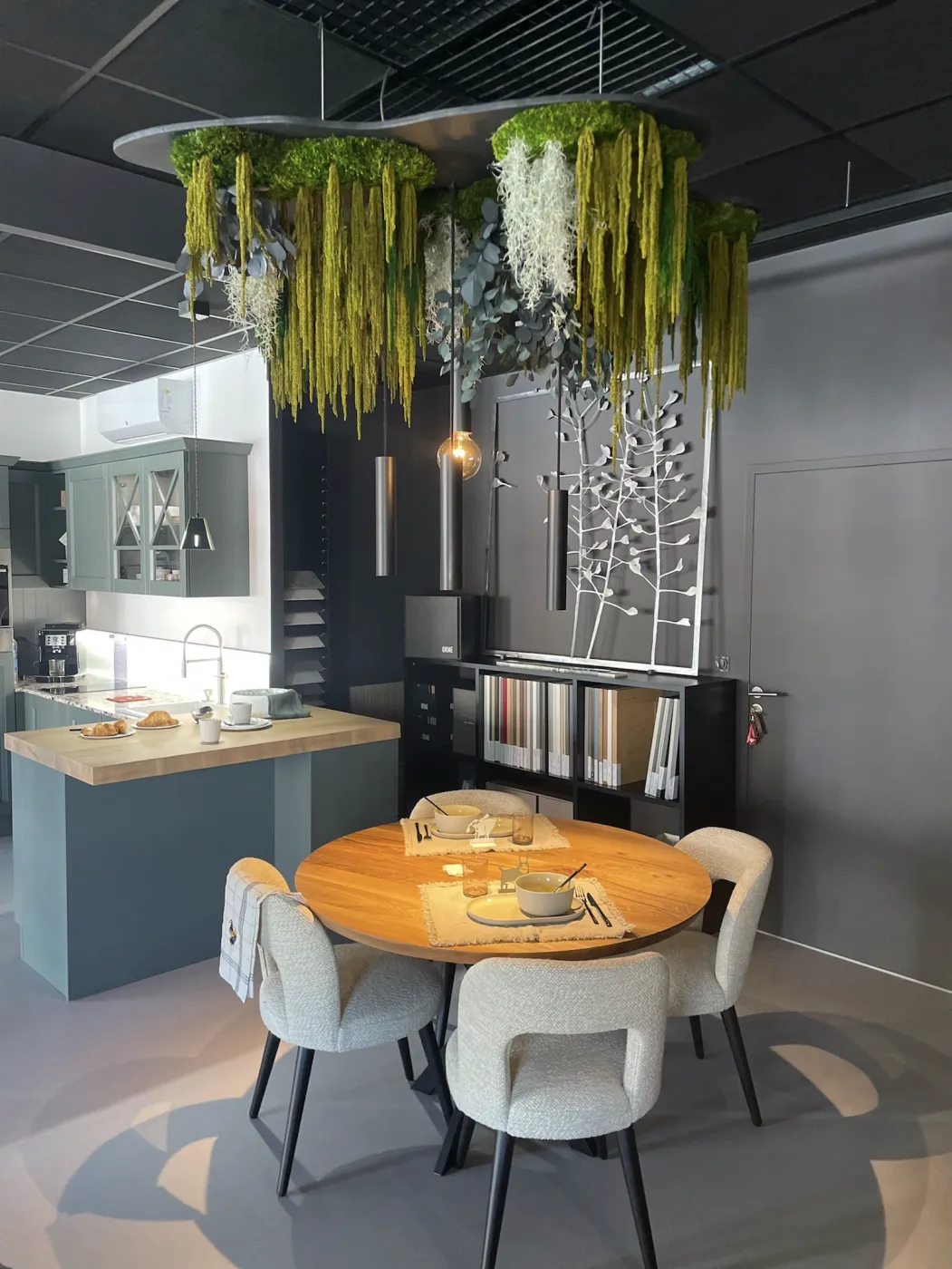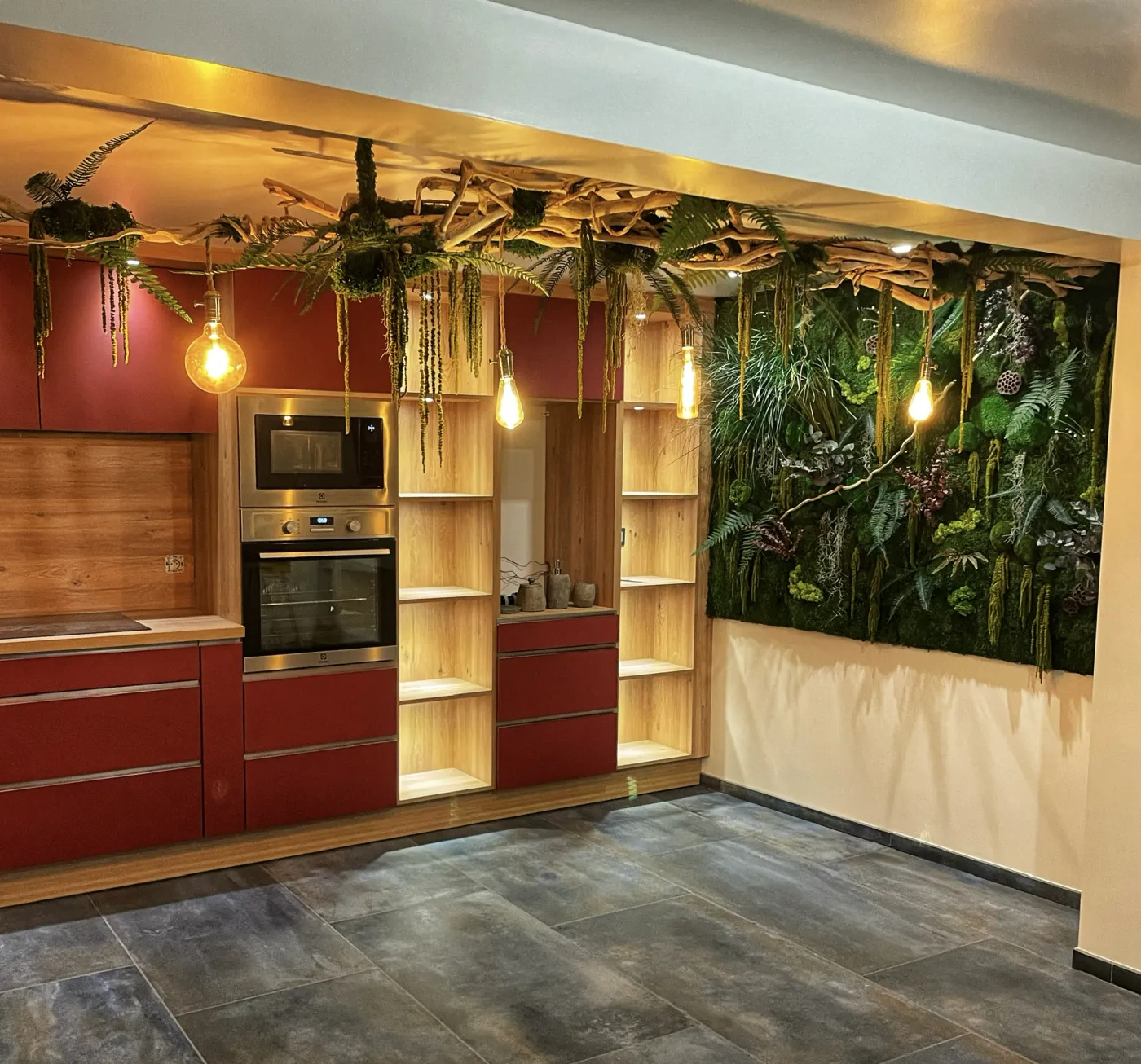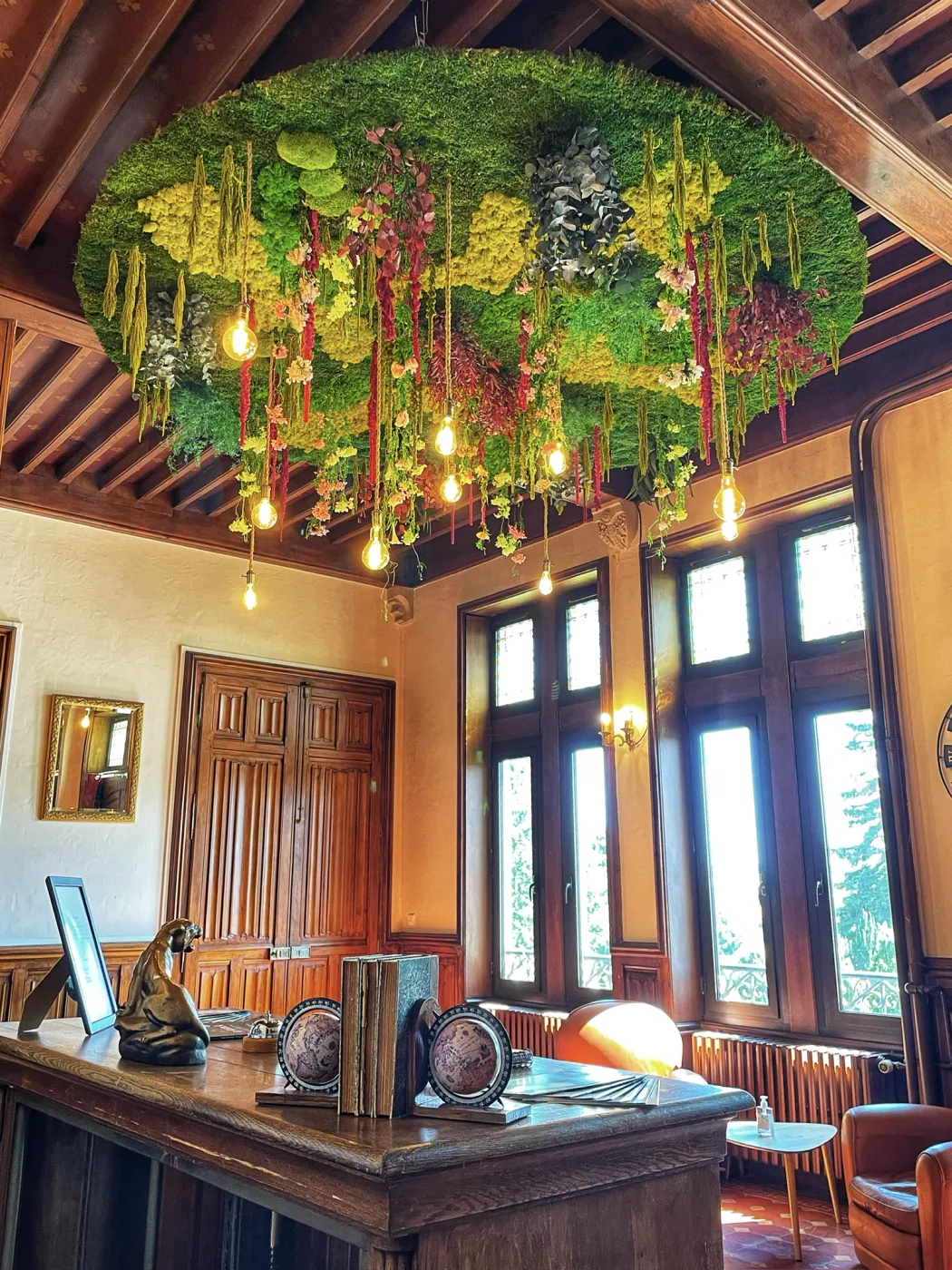 Lustres en bois flotté et végétaux stabilisés